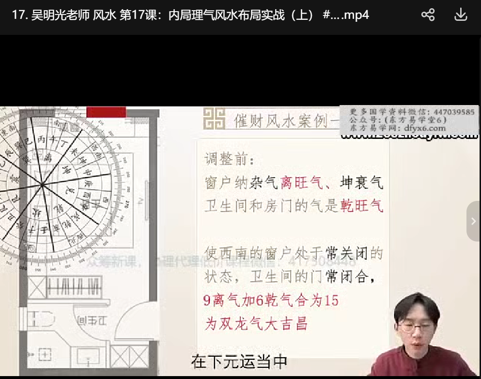吴明光-阳宅风水综合调理20集视频,讲解住宅各处的调理方案和一些实战经验。注意:视频有浮动水印不影响学习,但请谨慎对待,避免给你带来损失。介意的请不要下载。