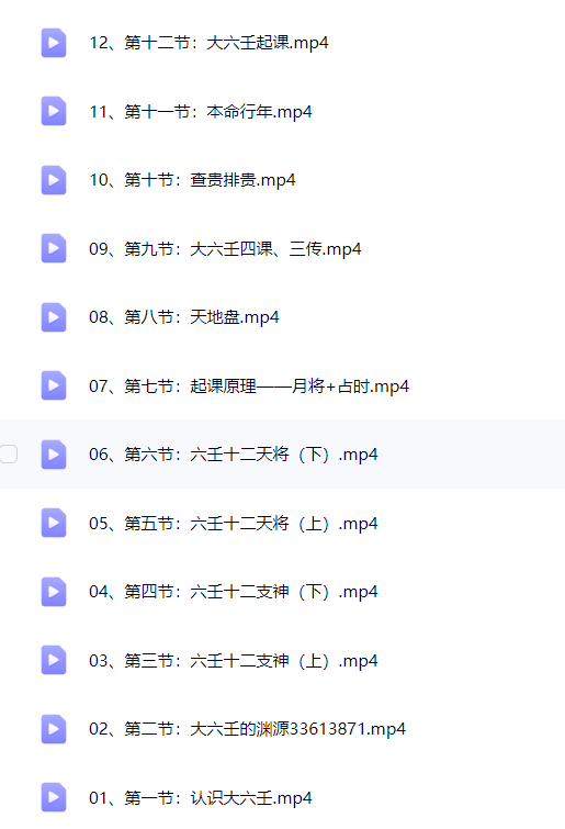高鸿儒《大六壬高级课程弟子班》39集,内容包含六壬十二支神、天将,本命行年,九宗门九大类,判断技巧,学员课堂实战等等,总体内容还是挺多的,适合学习。