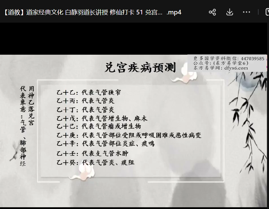 | ├──【道教】道家经典文化 白静羽道长讲授 修仙打卡 49 巽宫疾病预测.mp4 18.22M