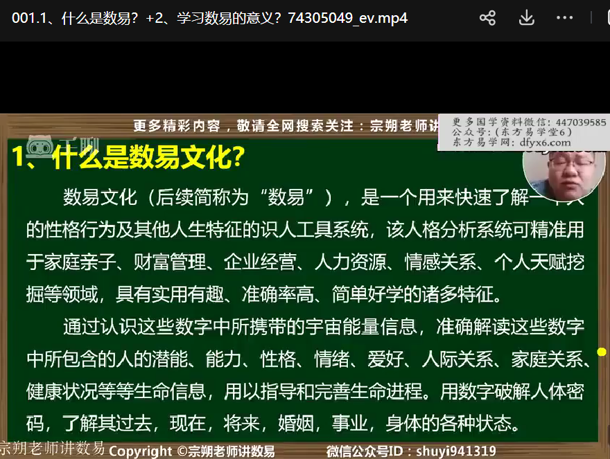 宗朔老师讲数易丨专业课 – 全新视频版53集。细讲数字应用,次讲姓名学和生肖。注意,第40集是录音,有两个版本,只听单独那个录音即可。