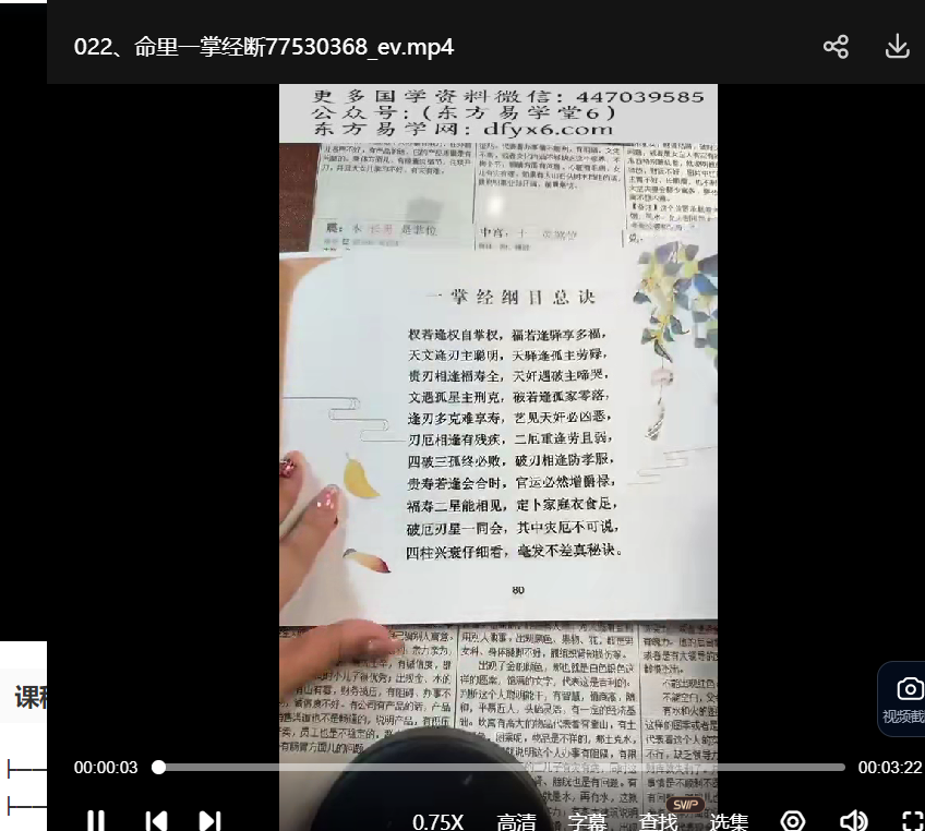 【道家文化工作室】孙真坤老师-一掌经课程视频39集,有干货,涵盖了一掌经直断、命理分析、行业选择、发展方向、家居风水等多个方面的内容。每集几分钟不等。
