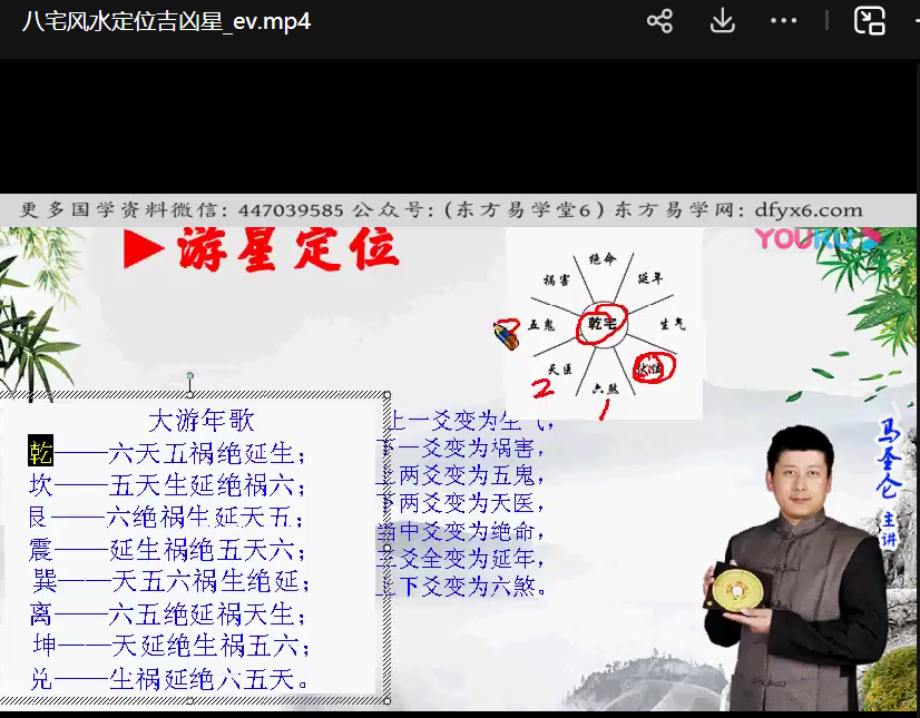 马圣仑 八宅风水视频课程 视频21集 ,虽然视频短小,但论点较多,内容不算少,各种知识要点均有讲解,但只能算是提点型的课程,非系统完整的课程。