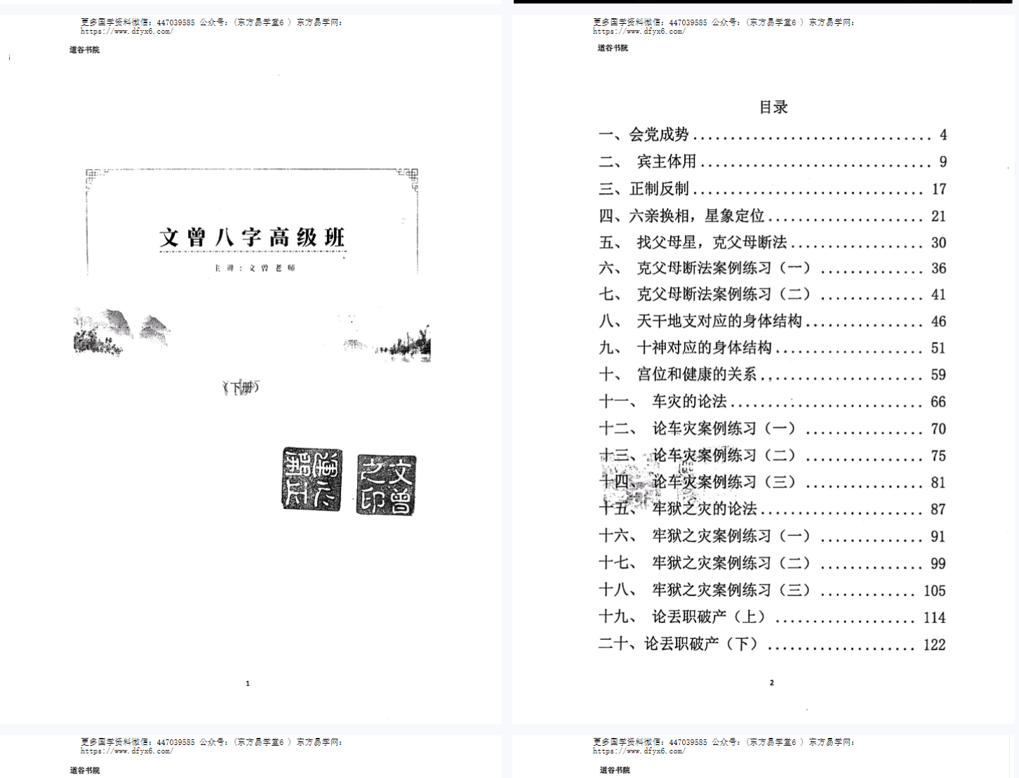 文曾八字高级班上下册pdf,讲解清楚八字的功用作用逻辑方式,和各种灾的断法,应期等。本资料属于进阶课程,内容有一定深度,不适合新手学习,因为看不懂。