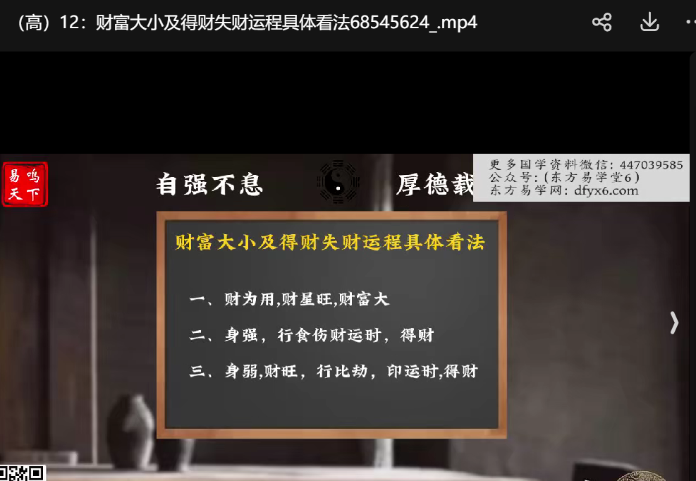 “中级班25集视频”主要内容是:涵盖日主强弱、生克制化刑冲合害、地支藏干、十二长生诀、命局岁运关系及不同强弱取用原则等内容