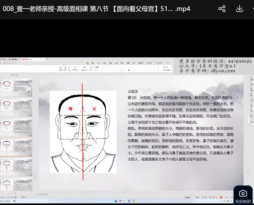 壹一老师亲授 高级面相课视频14集,内容涵盖五行人看法、八宫应事法、面向看六亲、子女、父母宫及风水等方面。