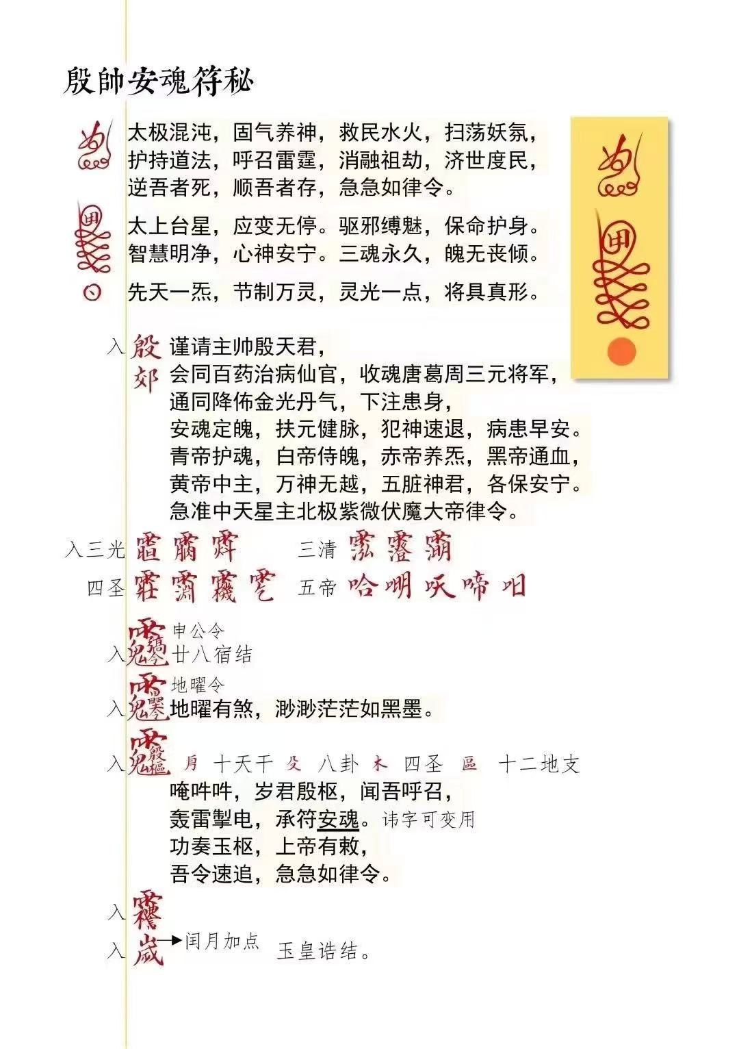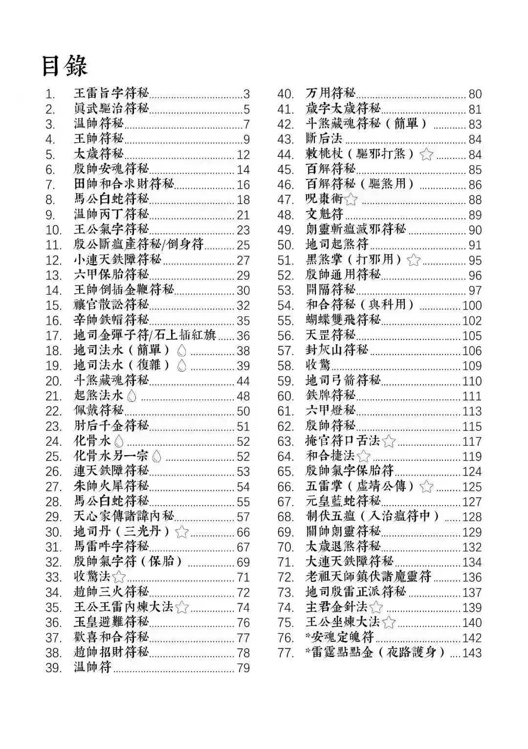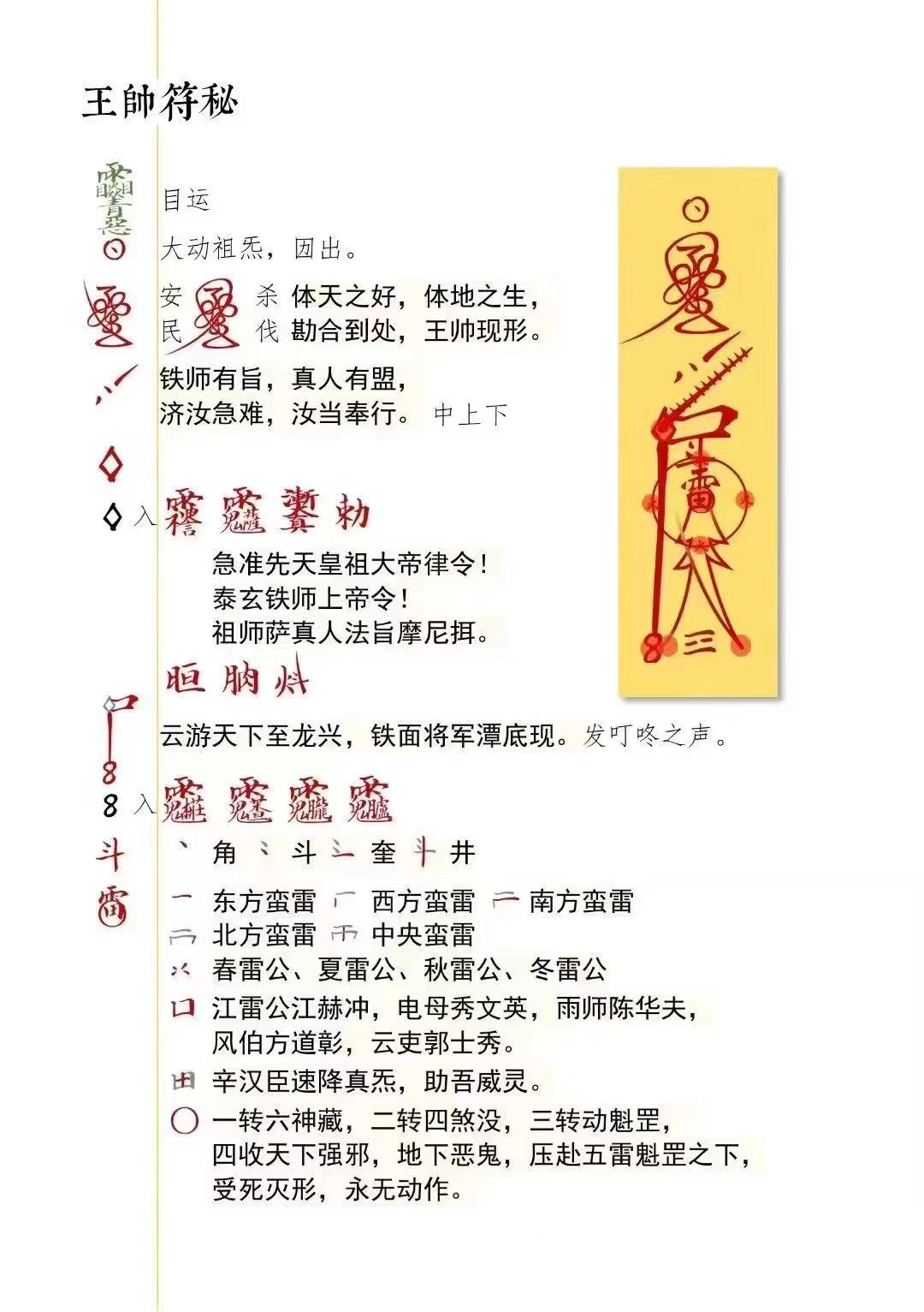 殷公断瘟产符秘/倒身符、地司起煞符、小连天鉄障符秘、黑煞掌(打邪用)、殷帅通用符秘、开隔符秘、六甲保胎符秘、王帅倒插金鞭符秘、官散讼符秘、辛帅铁帽符秘、和合符秘(真科用)、蝴蝶双飞符秘、天罡符秘、封灰山符、收惊、地司弓箭符秘等。