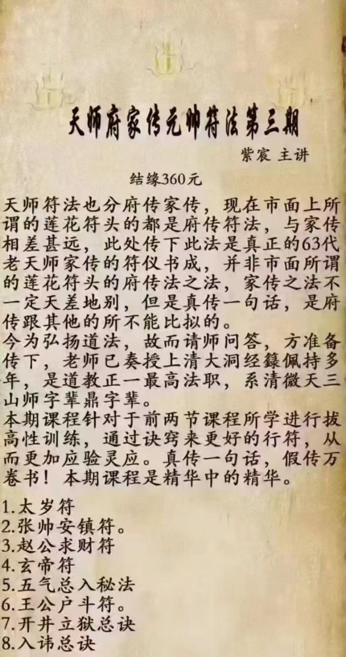 此法是真正的63代老天师家传符法,并非市面所谓的莲花符头的府传法之法,家传威力之大之效用,是府传跟其他的所不能比拟的。