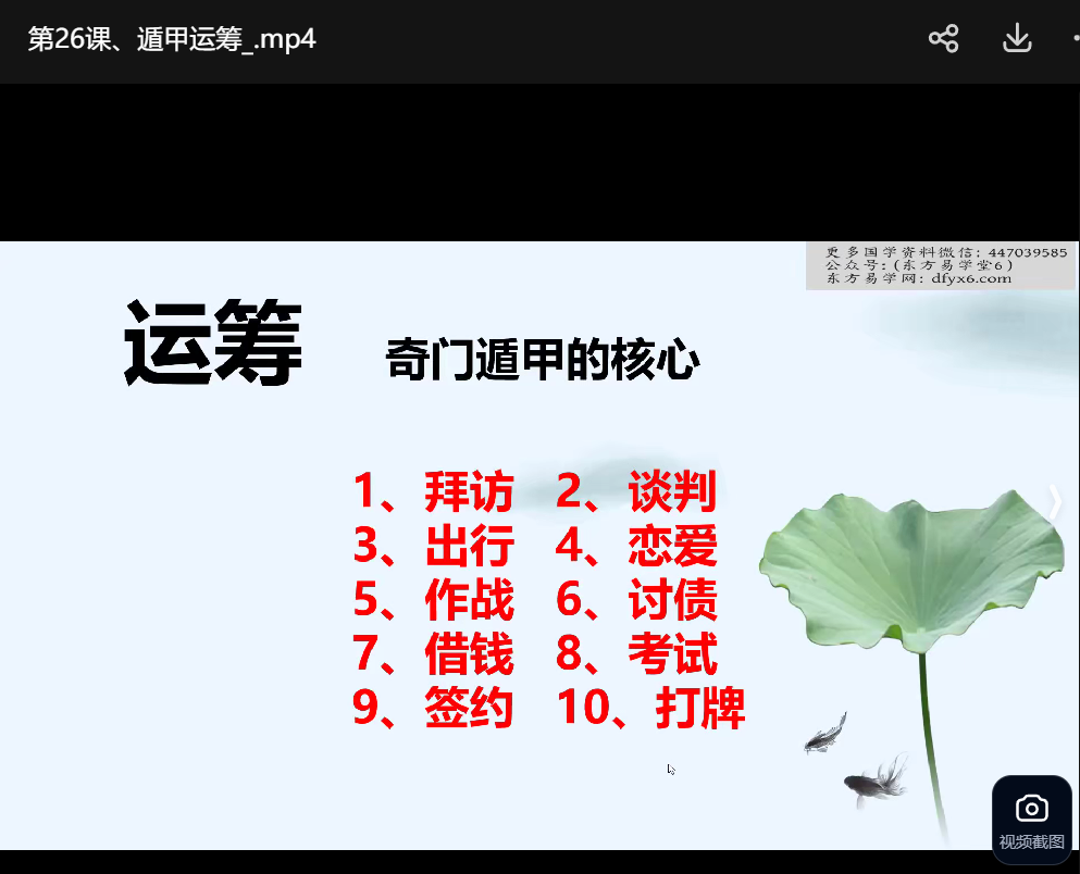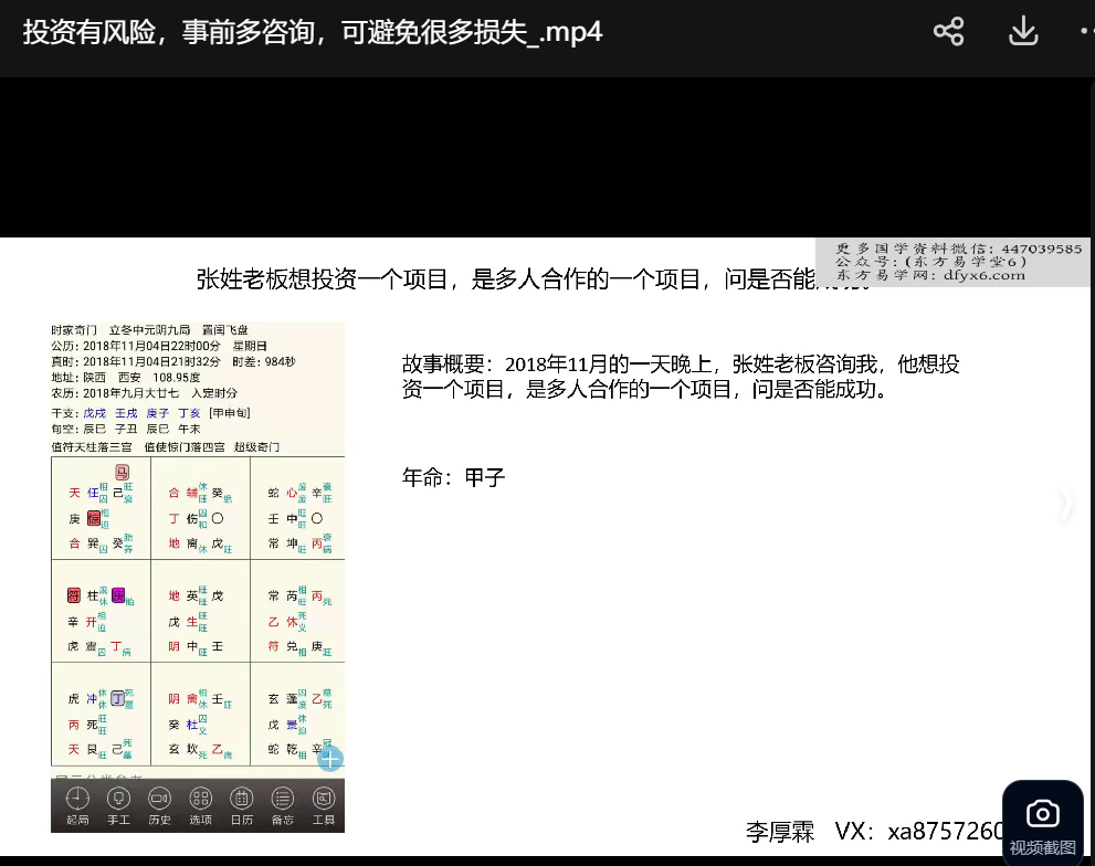 大家好,我是李厚霖,经过很长时间的考虑和准备,**遁甲函授班开课了,大家知道学习**遁甲最好的方式是面对面口传心授的方式,但是那个方式要求比较高,时间金钱都要有所付出,而且也害怕学不到太多东西,再有就是害怕一次学不会。我也跟很多想学习**遁甲的朋友聊过,他们大多都是这些想法,所以也在他们的请求下,我开设了这个**遁甲函授班,函授内容就是面授班上的内容,价格设在一个大家都能接受的范围,时间上可以不固定,大家有时间的时候就可以学习,而且学不会的可以反复的学习,直到学会为止。有兴趣学习**遁甲的朋友可以看看试看课程,课程内容我会陆续录制并上传上去,保证让你学到真东西。 《**遁甲》是中国古代术数著作,也是**、六壬、太乙三大秘宝中的第一大秘术,为三式之首,最有理法,被称为黄老道家最高层次的预测学,号称帝王之学/最高预测学,创始人为九天玄女,其本质是一门高等的天文物理学,揭示了太阳系八大行星和地球磁场的作用情况。 飞盘**是最为古老的**遁甲,真正的帝王之术,古代用于军事,如今用于生活与商业。 飞盘**,为**遁甲原始正宗,最重动静主客,没有动静主客,就没能进入**遁甲的核心。 现代社会运用飞盘**为我们谋划布局,效果斐然。然而,大多研习者还是徘徊在精妙大门之外,一者盘式复杂,难以精进;二者未得师传,不明真法。实际上,“**遁甲是极为简捷的,“真传一句话,假传万卷书”。只要领悟“主客动静”这一核心要领,一入门即达上乘。 飞盘**是数术领域用法至简、成效阜者的一门学问和技术。古时两军对垒,千钧一发之际,飞盘**设局运筹,选择时空方位,**,斡旋造化,在一万种不可能中寻找一种可能,在宇宙天体能量利我情况下我方选时空、钻时空、造时空。诱敌撞入,从而运筹帷幄取得圆满胜利。飞盘**,源于军事,用于日常;变化无穷,功效强大。 在飞速发展的当今社会,我们利用飞盘**应用于企业运作管理决策,商务洽谈、项目竞标、出行择日、开工动土、选址经营等重要商务活动,婚姻嫁娶,催旺;家庭和谐等生活各方面。 **遁甲博大精深,要学习的话,需要化繁为简,每天学一点,每天学一个知识点,李厚霖老师把**遁甲的基础知识剪辑成单个的知识点,每个知识点只需要最多一分钟就可以看完学完,每天让你抽出一分钟的时间跟随李厚霖老师学习**遁甲,让你掌握**遁甲的神奇之处。 实战案例分析主要讲解**遁甲的真实案例,把更多的知识点揉到20个真实经典案例中,让你通过案例学习来提升实战水平,是具有**遁甲基础的朋友们必选专栏。