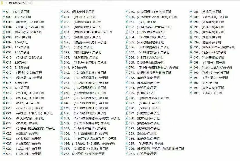 【易学】何庚淼最新《易学弟子班》教学视频104集 何爽易学弟子班课程体系介绍 何爽易学弟子班,汇聚多元易学智慧,构建系统课程矩阵。从时空卦、面相(含断流年、婚姻、财富等多维度)、手机号码(选号、化解等应用),到风水(阳宅、阴宅、古法八宅,含案例实操)、八卦(先天后天推演)、文昌局、配婚等专题,覆盖100+细分课程 。 无论想钻研命理预测、环境风水布局,还是探索数字能量、头像风水奥秘,都能在此找到对应板块。课程以案例贯穿,理论结合实操,助力学员逐步掌握易学精髓,开启传统易学文化研习进阶之路,传承与应用古老智慧 。