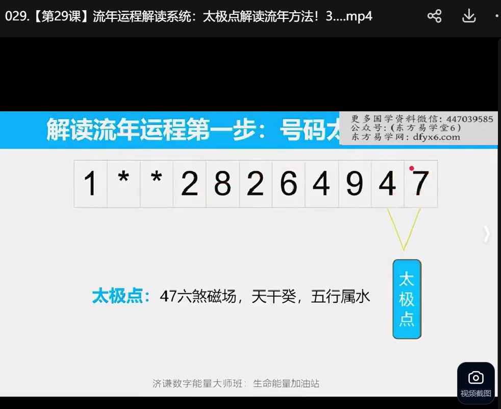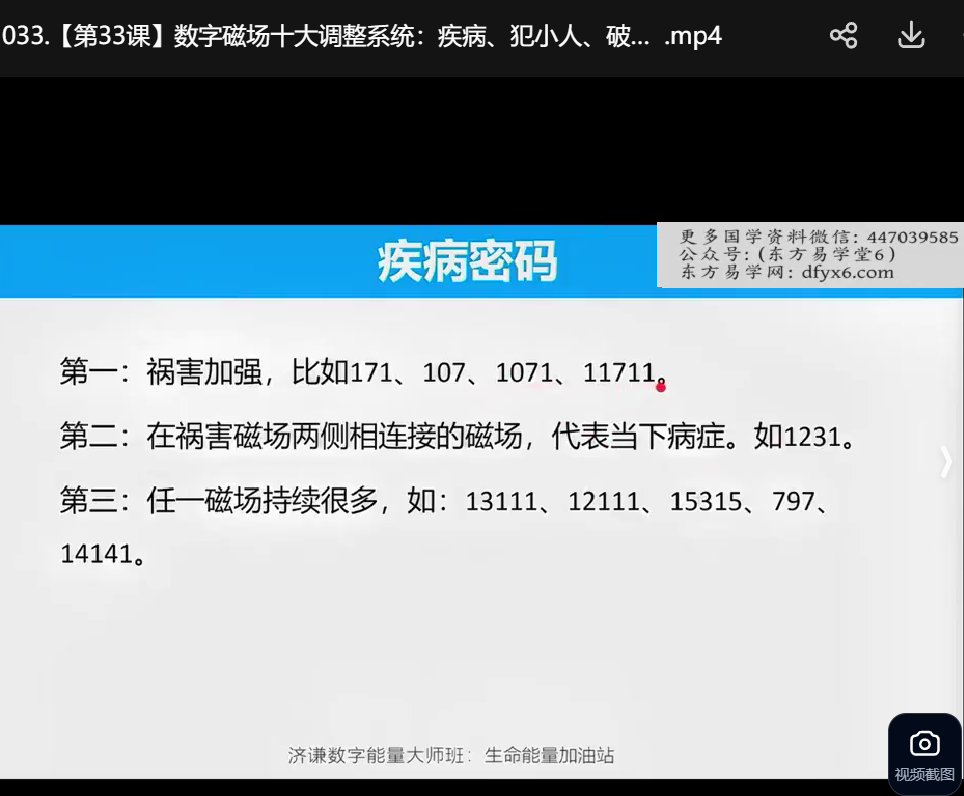 数字调频能量大师班:一站式解锁八星、解读、配号、化解、流年 视频50集。涵盖楼层、车牌、银行卡等场景的号码选配与化解技巧,以及个人流年运势分析。一套比较详细的数字能量课程,涉及面广,实用性强。
