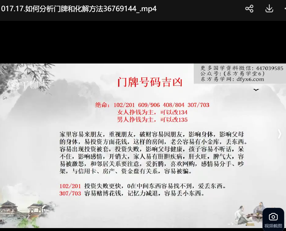 | | ├──017.17.如何分析门牌和化解方法.mp4 128.48M