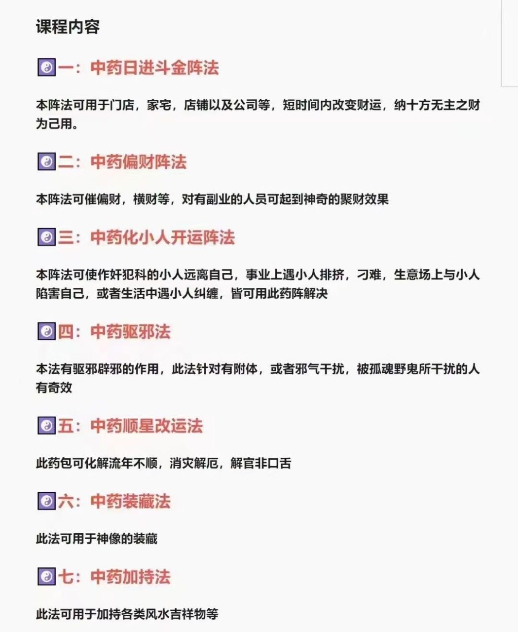 课程内容 ☯一:中药进日斗金阵法 本阵法可于用门店,家宅,店铺以公及司等,短时间内改财变运,纳十方无主财之为己用。