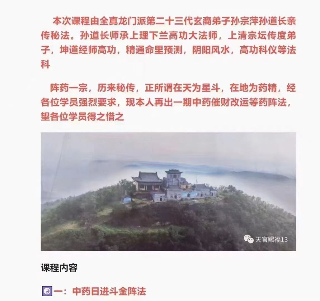本课次程由真全龙门派二第十三代玄弟裔子孙萍宗孙道长传亲秘法。孙长道师承上理兰下高功大法师,上清宗坛传弟度子,坤道师经高功,精命通里预测,阴阳风水,高功科仪等法科 阵药一宗,历来秘传,正谓所在天为星斗,在地药为精,经各位学员烈强要求,现本人再出一期药中催财改运等阵药法,望各学位员得惜之之。